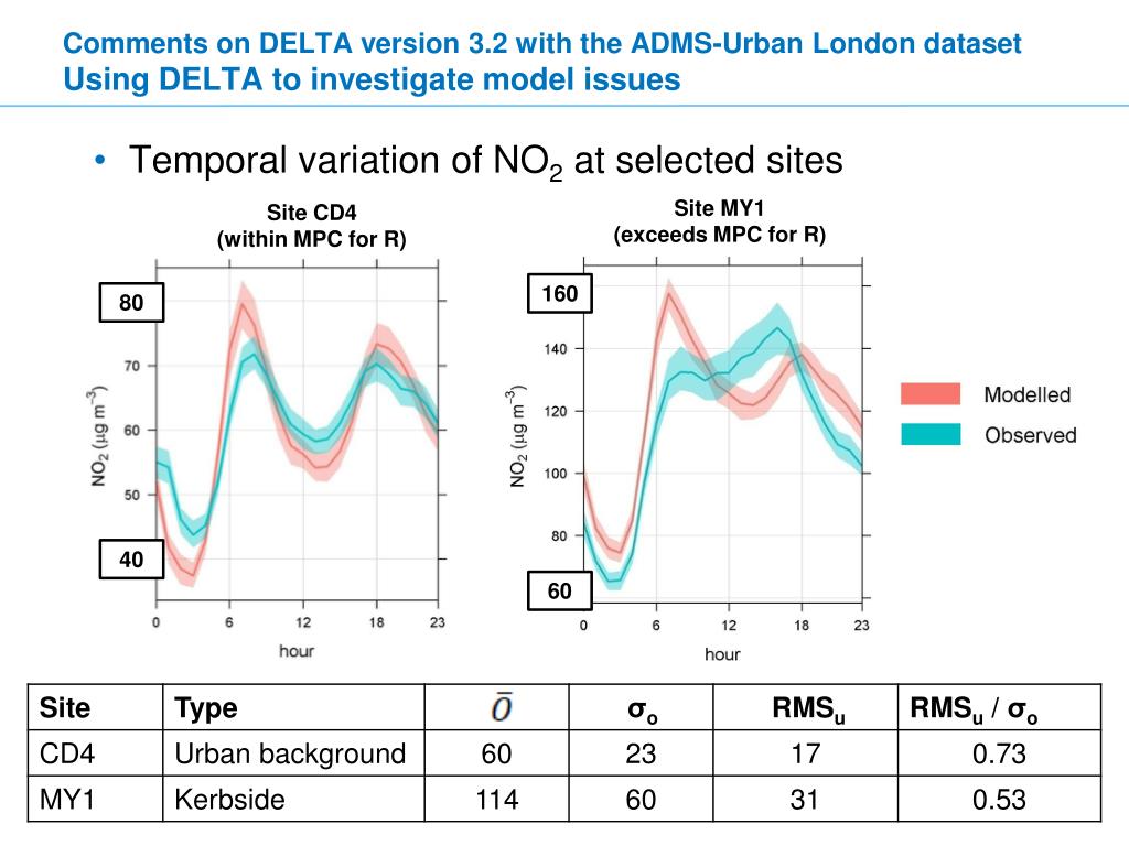 Comments on DELTA version 3.2 with the ADMS-Urban London datasetUsing DELTA to investigate model issues • Temporal variation of NO2 at selected sites Site MY1 (exceeds MPC for R) Site CD4 (within MPC for R) 160 80 40 60