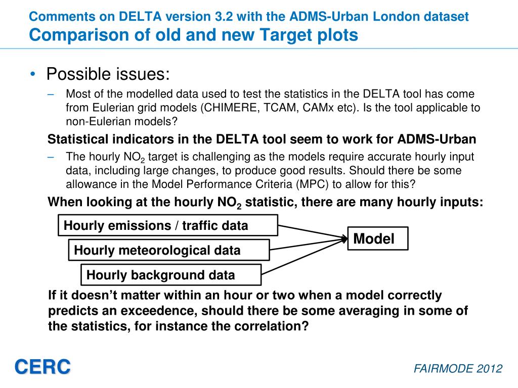 Comments on DELTA version 3.2 with the ADMS-Urban London datasetComparison of old and new Target plots • Possible issues: • Most of the modelled data used to test the statistics in the DELTA tool has come from Eulerian grid models (CHIMERE, TCAM, CAMx etc). Is the tool applicable to non-Eulerian models? Statistical indicators in the DELTA tool seem to work for ADMS-Urban • The hourly NO2 target is challenging as the models require accurate hourly input data, including large changes, to produce good results. Should there be some allowance in the Model Performance Criteria (MPC) to allow for this? When looking at the hourly NO2 statistic, there are many hourly inputs: If it doesn’t matter within an hour or two when a model correctly predicts an exceedence, should there be some averaging in some of the statistics, for instance the correlation? Hourly emissions / traffic data Model Hourly meteorological data Hourly background data