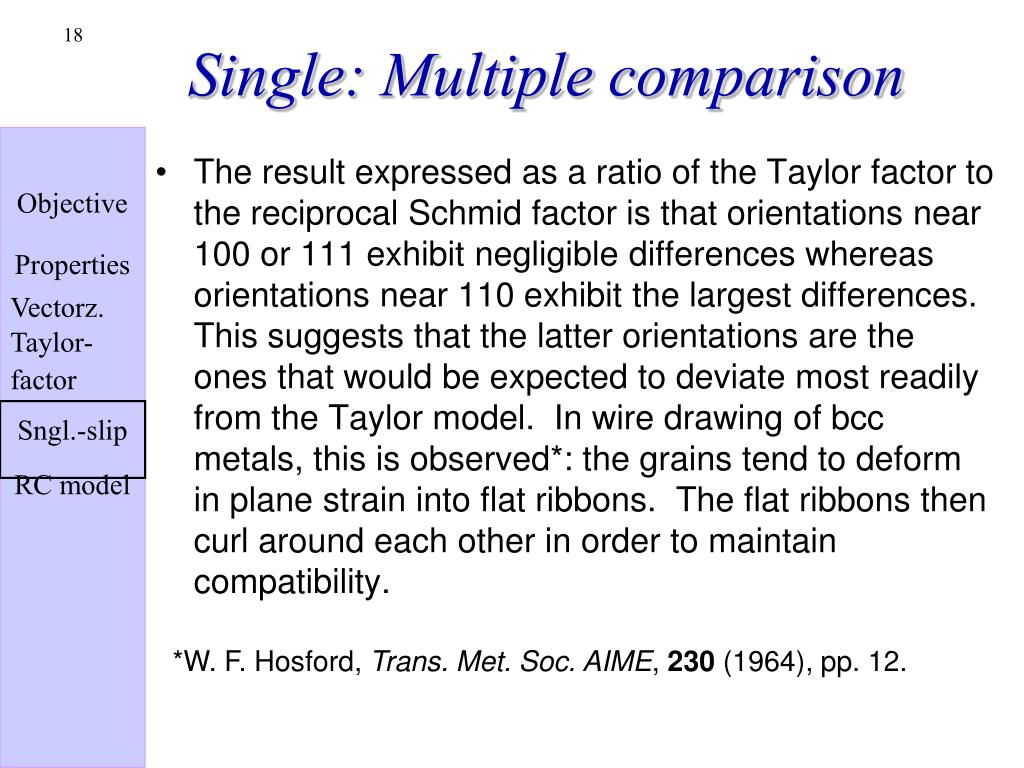 Single: multiple comparison • It is interesting to consider the difference between multiple slip and single slip stress levels because of its relevance to deviations from the Taylor model. Hosford presents an analysis of the ratio between the stress required for multiple slip and the stress for single slip under axisymmetric deformation conditions (in {111}<110> slip).