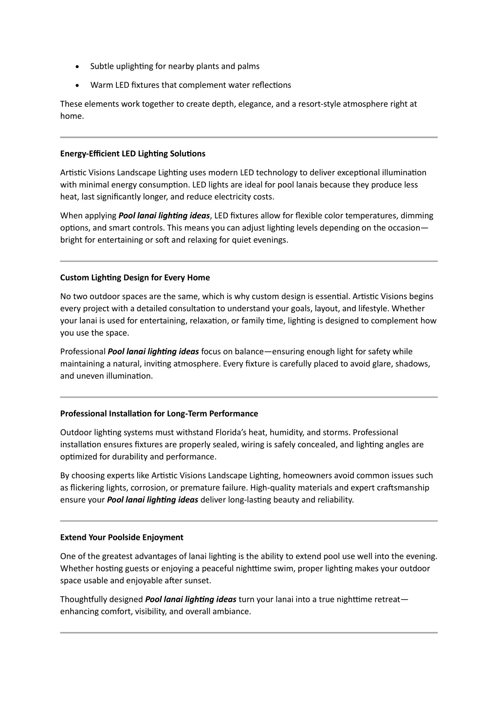 • Subtle uplighting for nearby plants and palms • Warm LED fixtures that complement water reflections These elements work together to create depth, elegance, and a resort-style atmosphere right at home. Energy-Efficient LED Lighting Solutions Artistic Visions Landscape Lighting uses modern LED technology to deliver exceptional illumination with minimal energy consumption. LED lights are ideal for pool lanais because they produce less heat, last significantly longer, and reduce electricity costs. When applying Pool lanai lighting ideas, LED fixtures allow for flexible color temperatures, dimming options, and smart controls. This means you can adjust lighting levels depending on the occasion— bright for entertaining or soft and relaxing for quiet evenings. Custom Lighting Design for Every Home No two outdoor spaces are the same, which is why custom design is essential. Artistic Visions begins every project with a detailed consultation to understand your goals, layout, and lifestyle. Whether your lanai is used for entertaining, relaxation, or family time, lighting is designed to complement how you use the space. Professional Pool lanai lighting ideas focus on balance—ensuring enough light for safety while maintaining a natural, inviting atmosphere. Every fixture is carefully placed to avoid glare, shadows, and uneven illumination. Professional Installation for Long-Term Performance Outdoor lighting systems must withstand Florida’s heat, humidity, and storms. Professional installation ensures fixtures are properly sealed, wiring is safely concealed, and lighting angles are optimized for durability and performance. By choosing experts like Artistic Visions Landscape Lighting, homeowners avoid common issues such as flickering lights, corrosion, or premature failure. High-quality materials and expert craftsmanship ensure your Pool lanai lighting ideas deliver long-lasting beauty and reliability. Extend Your Poolside Enjoyment One of the greatest advantages of lanai lighting is the ability to extend pool use well into the evening. Whether hosting guests or enjoying a peaceful nighttime swim, proper lighting makes your outdoor space usable and enjoyable after sunset. Thoughtfully designed Pool lanai lighting ideas turn your lanai into a true nighttime retreat— enhancing comfort, visibility, and overall ambiance.