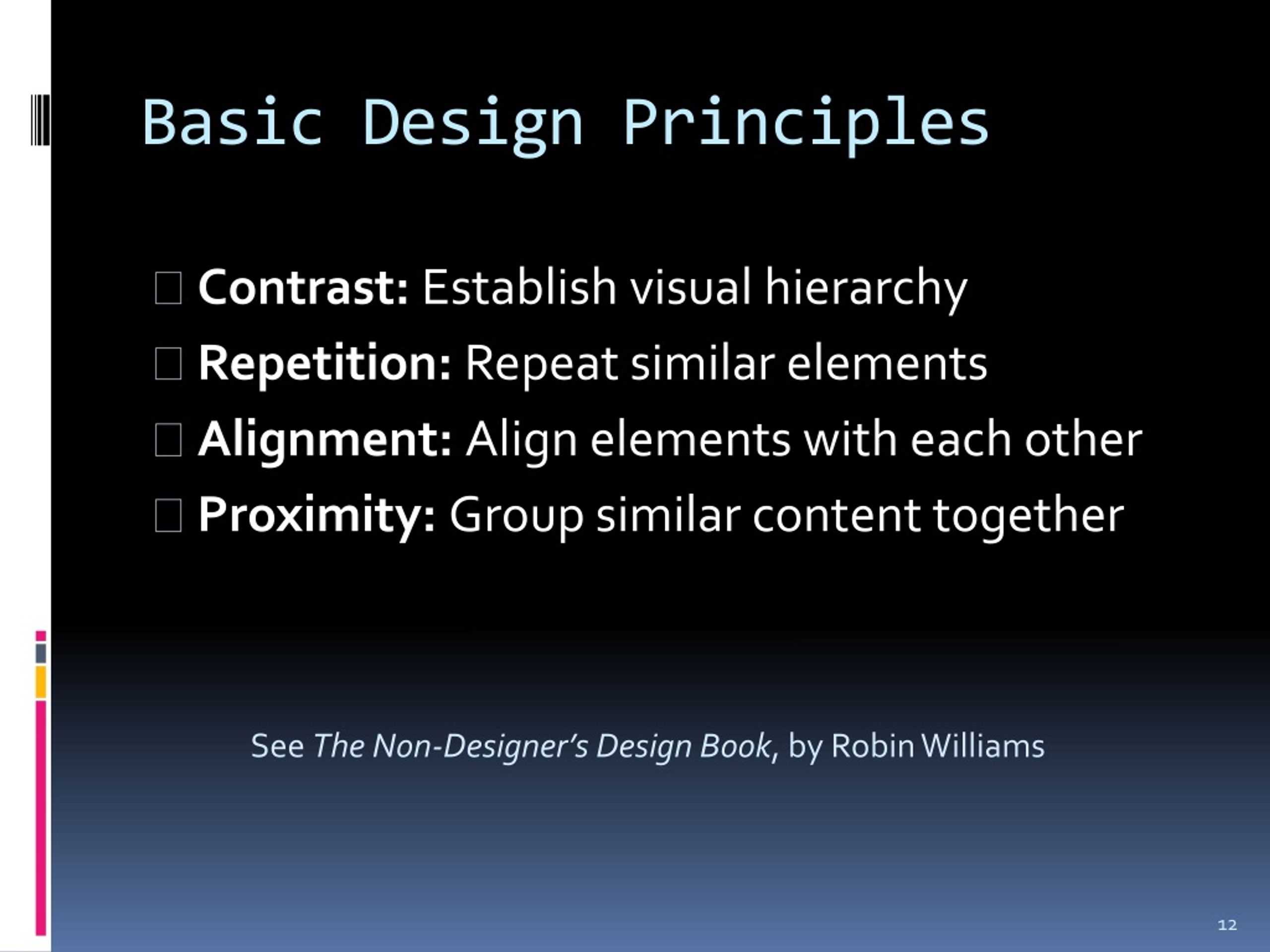 Basic Design Principles • Contrast: Establish visual hierarchy • Repetition: Repeat similar elements • Alignment: Align elements with each other • Proximity: Group similar content together See The Non-Designer’s Design Book, by Robin Williams