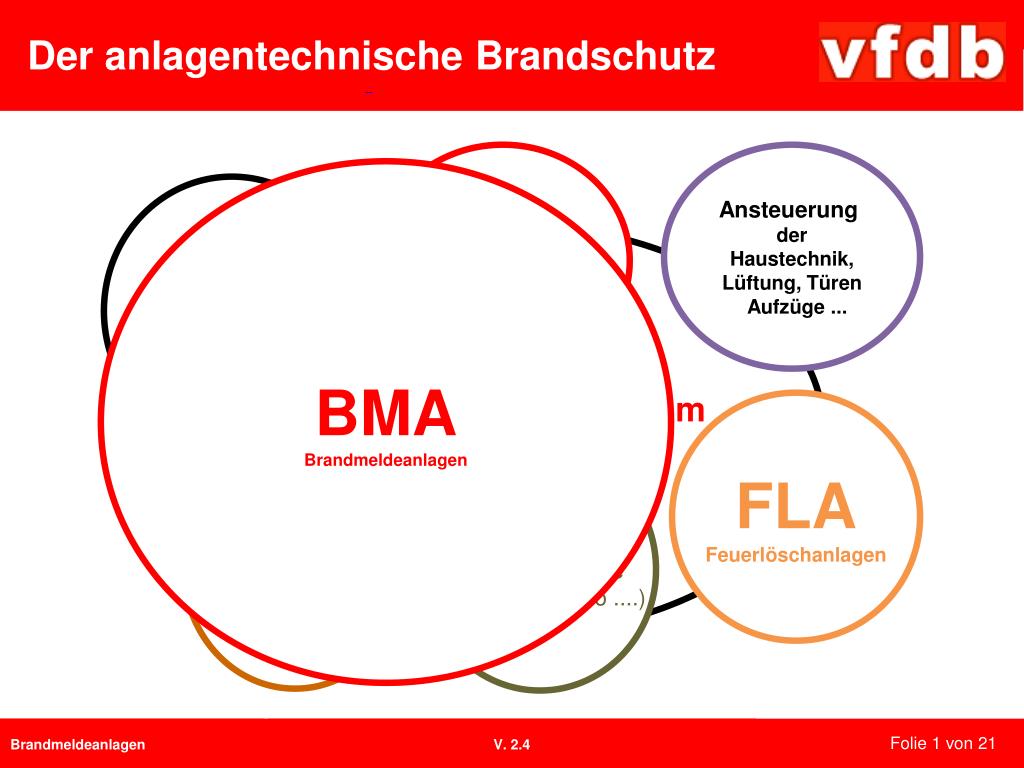Der anlagentechnische Brandschutz. BMA Brandmeldeanlagen. Ansteuerung der Haustechnik, Lüftung, Türen Aufzüge. BMA Brandmeldeanlagen. SAA Sprachalarmanlagen, Evakuierung. .... wirkt nur gemeinsam. FLA Feuerlöschanlagen. RWA Rauch- und Wärmeabzugsanlagen. Ansteuerung