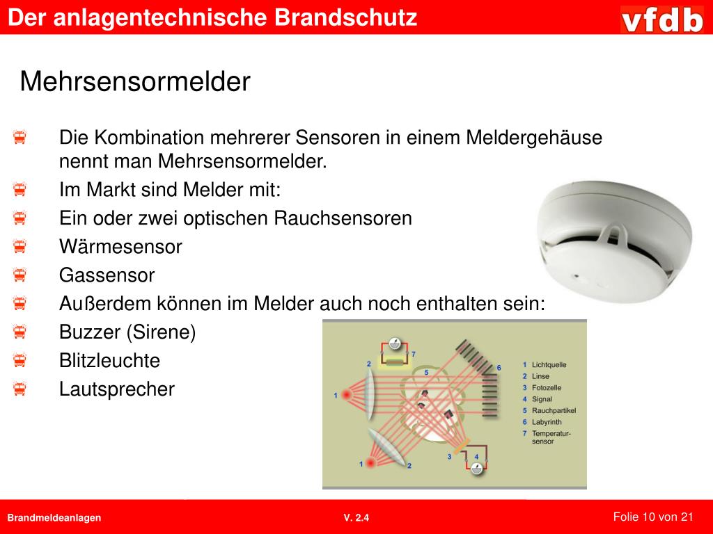 Die Kombination mehrerer Sensoren in einem Meldergehäuse nennt man Mehrsensormelder. Im Markt sind Melder mit: Ein oder zwei optischen Rauchsensoren Wärmesensor Gassensor Außerdem können im Melder auch noch enthalten sein: Buzzer (Sirene) Blitzleuchte Lautsprecher Mehrsensormelder Folie 10 von 21