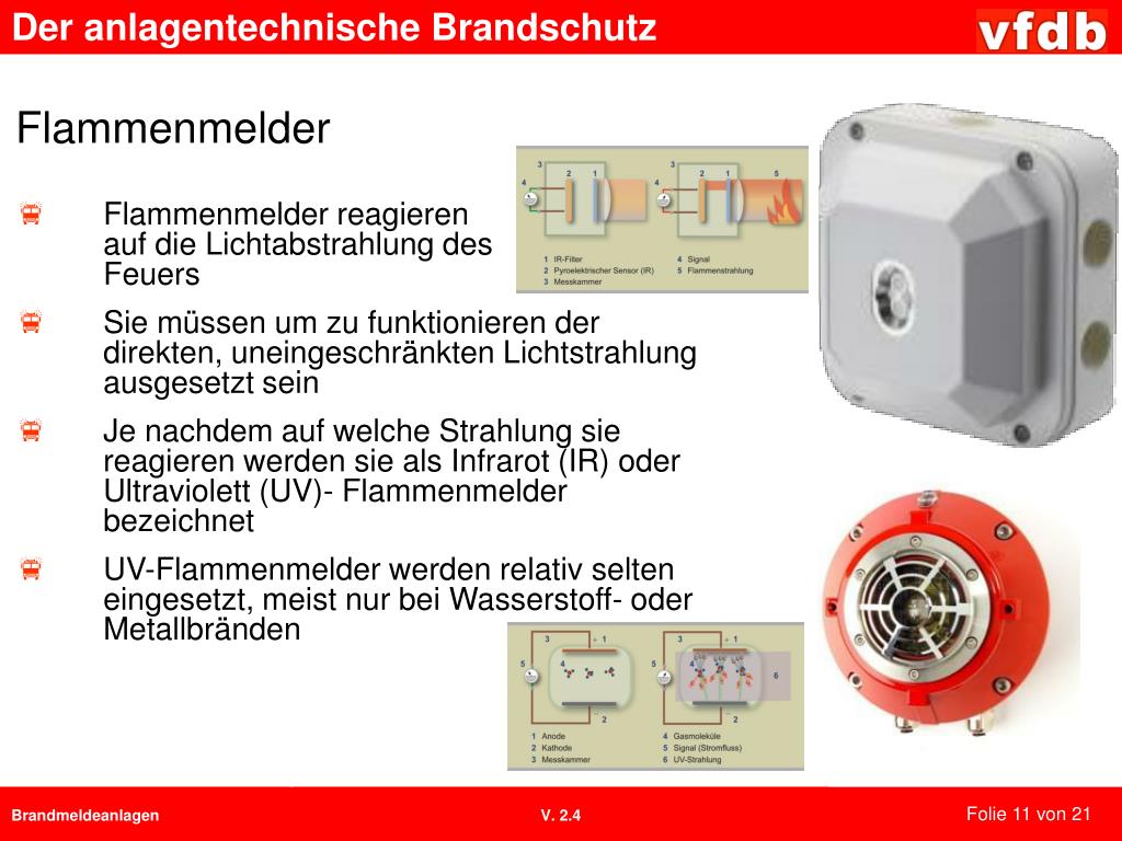 Flammenmelder • Flammenmelder reagieren auf die Lichtabstrahlung des Feuers • Sie müssen um zu funktionieren der direkten, uneingeschränkten Lichtstrahlung ausgesetzt sein • Je nachdem auf welche Strahlung sie reagieren werden sie als Infrarot (IR) oder Ultraviolett (UV)- Flammenmelder bezeichnet • UV-Flammenmelder werden relativ selten eingesetzt, meist nur bei Wasserstoff- oder Metallbränden Folie 11 von 21
