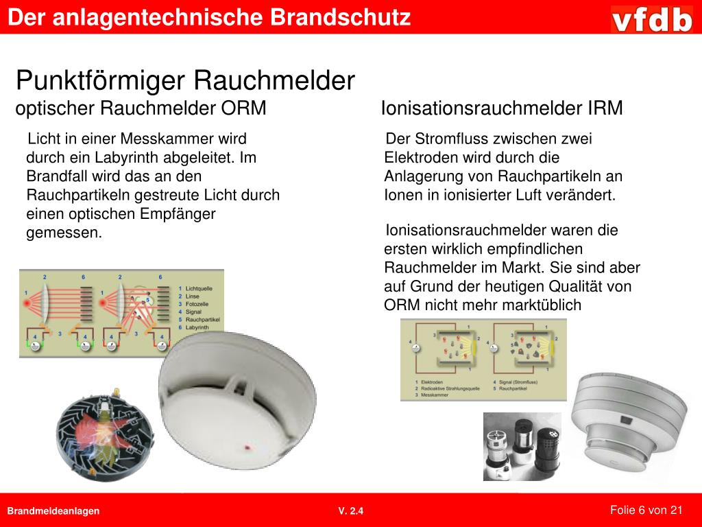 Der Stromfluss zwischen zwei Elektroden wird durch die Anlagerung von Rauchpartikeln an Ionen in ionisierter Luft verändert. Ionisationsrauchmelder waren die ersten wirklich empfindlichen Rauchmelder im Markt. Sie sind aber auf Grund der heutigen Qualität von ORM nicht mehr marktüblich Punktförmiger Rauchmelderoptischer Rauchmelder ORM Ionisationsrauchmelder IRM Licht in einer Messkammer wird durch ein Labyrinth abgeleitet. Im Brandfall wird das an den Rauchpartikeln gestreute Licht durch einen optischen Empfänger gemessen. Folie 6 von 21