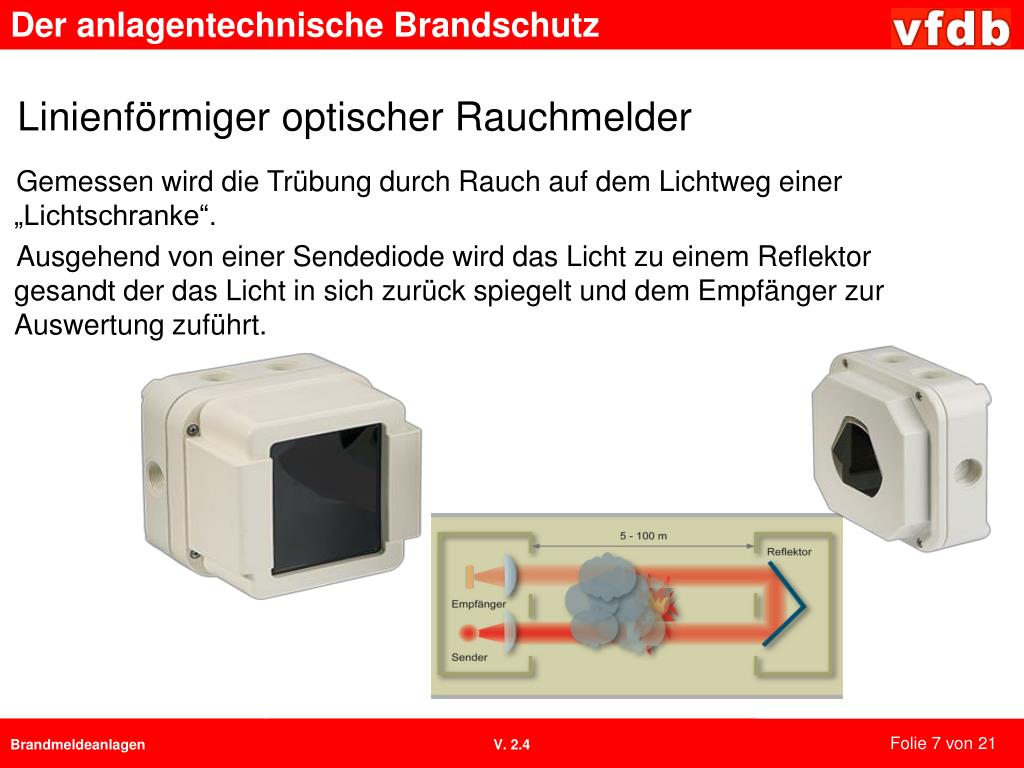 Linienförmiger optischer Rauchmelder Gemessen wird die Trübung durch Rauch auf dem Lichtweg einer „Lichtschranke“. Ausgehend von einer Sendediode wird das Licht zu einem Reflektor gesandt der das Licht in sich zurück spiegelt und dem Empfänger zur Auswertung zuführt. Folie 7 von 21