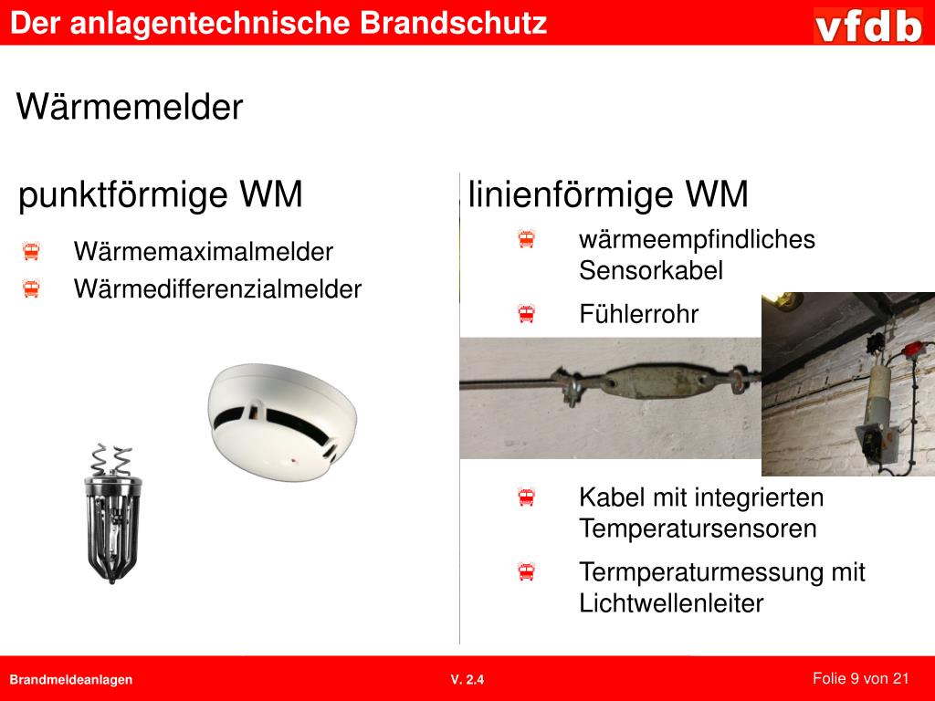 punktförmige WM linienförmige WM Wärmemaximalmelder Wärmedifferenzialmelder Wärmemelder • wärmeempfindliches Sensorkabel • Fühlerrohr • Kabel mit integrierten Temperatursensoren • Termperaturmessung mit Lichtwellenleiter Folie 9 von 21