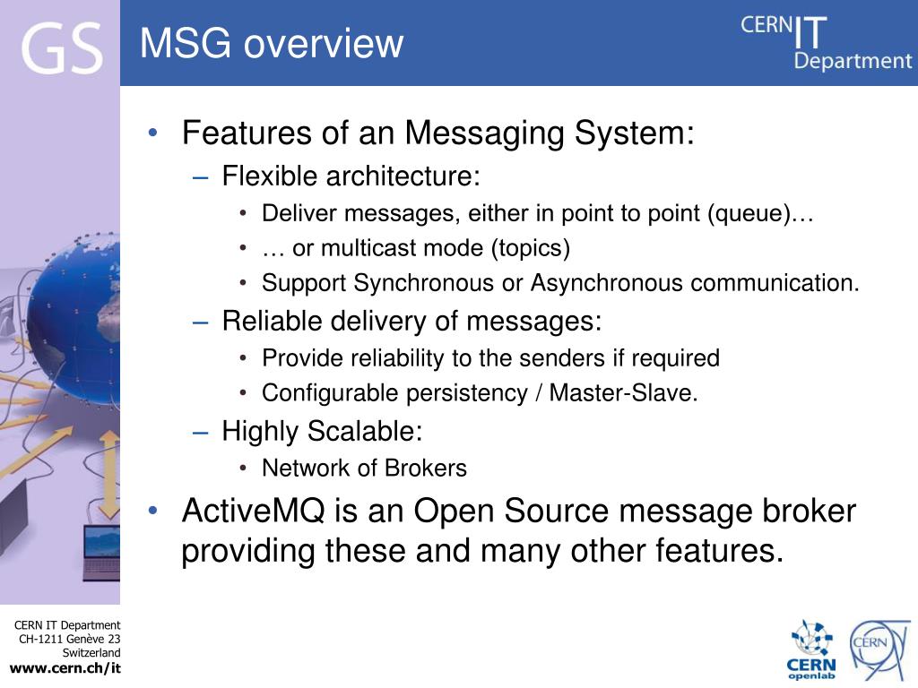 MSG overview • Features of an Messaging System: • Flexible architecture: • Deliver messages, either in point to point (queue)… • … or multicast mode (topics) • Support Synchronous or Asynchronous communication. • Reliable delivery of messages: • Provide reliability to the senders if required • Configurable persistency / Master-Slave. • Highly Scalable: • Network of Brokers • ActiveMQ is an Open Source message broker providing these and many other features.