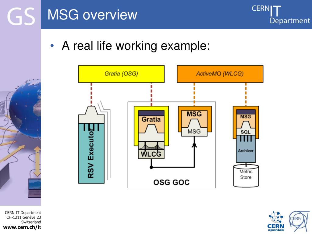 Presentation Summary • MSG overview • Timeline • ActiveMQ • Msg-publish-simple • Msg-consumer2oracle • Current deployments • OSG • Gridview • Next steps