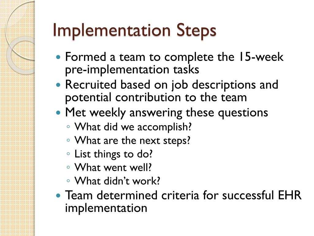 Implementation Steps • Formed a team to complete the 15-week pre-implementation tasks • Recruited based on job descriptions and potential contribution to the team • Met weekly answering these questions • What did we accomplish? • What are the next steps? • List things to do? • What went well? • What didn’t work? • Team determined criteria for successful EHR implementation