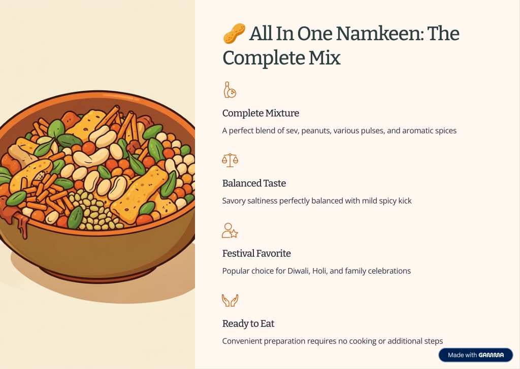 ? All In One Namkeen: The Complete Mix Complete Mixture A perfect blend of sev, peanuts, various pulses, and aromatic spices Balanced Taste Savory saltiness perfectly balanced with mild spicy kick Festival Favorite Popular choice for Diwali, Holi, and family celebrations Ready to Eat Convenient preparation requires no cooking or additional steps