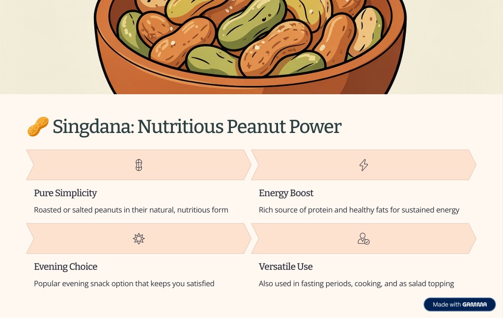 ? Singdana: Nutritious Peanut Power Pure Simplicity Energy Boost Roasted or salted peanuts in their natural, nutritious form Rich source of protein and healthy fats for sustained energy Evening Choice Versatile Use Popular evening snack option that keeps you satisfied Also used in fasting periods, cooking, and as salad topping