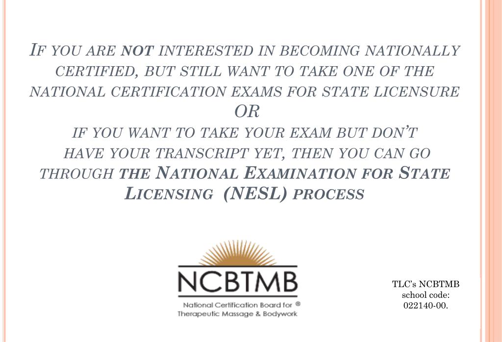 If you are not interested in becoming nationally certified, but still want to take one of the national certification exams for state licensure OR if you want to take your exam but don’t have your transcript yet, then you can go through the National Examination for State Licensing (NESL) process TLC’s NCBTMB school code: 022140-00.