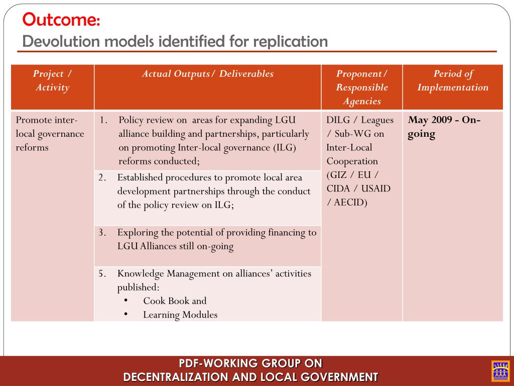 Philippine Development Forum Working Group on Decentralization and Local Government. PDF-WORKING GROUP ON DECENTRALIZATION AND LOCAL GOVERNMENT. Accomplishments on the Work Plan. Outcome: Meaningful engagement of people’s organizations in local governance.
