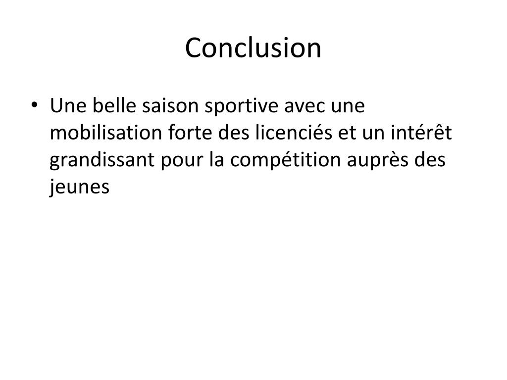 Conclusion • Une belle saison sportive avec une mobilisation forte des licenciés et un intérêt grandissant pour la compétition auprès des jeunes