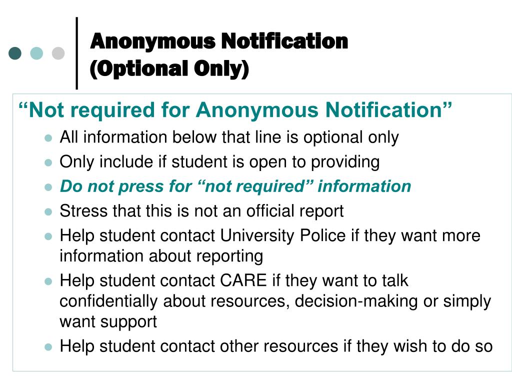 Anonymous Notification(Optional Only) “Not required for Anonymous Notification” • All information below that line is optional only • Only include if student is open to providing • Do not press for “not required” information • Stress that this is not an official report • Help student contact University Police if they want more information about reporting • Help student contact CARE if they want to talk confidentially about resources, decision-making or simply want support • Help student contact other resources if they wish to do so