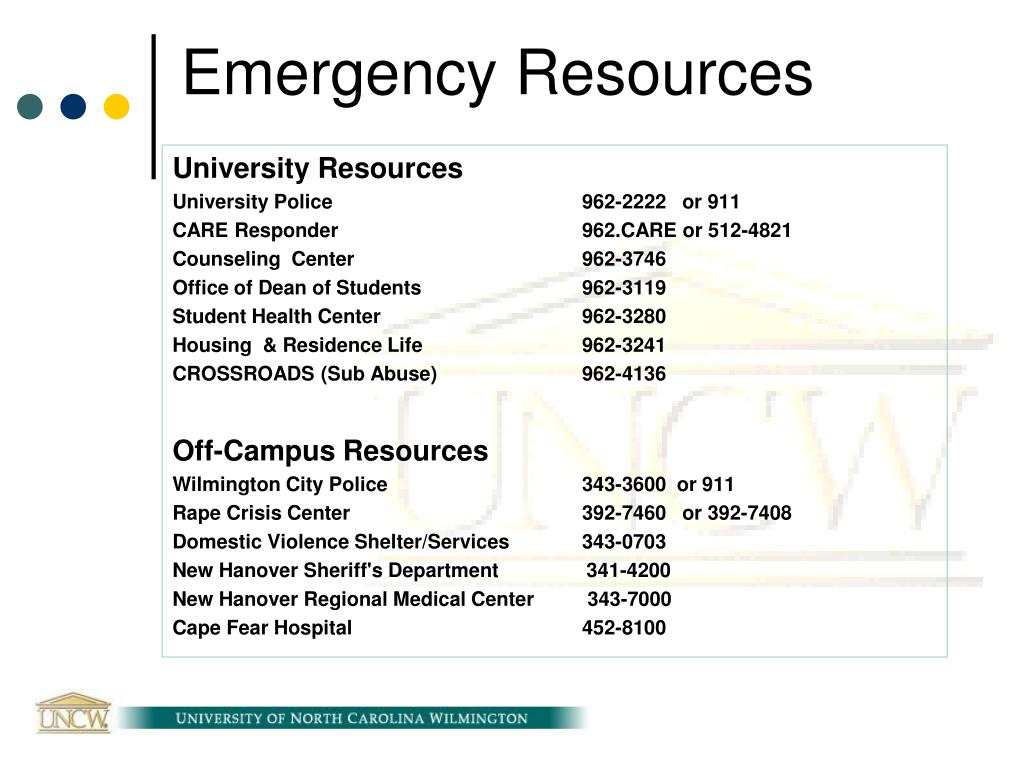 Emergency Resources University Resources University Police 962-2222 or 911 CARE Responder 962.CARE or 512-4821 Counseling Center 962-3746 Office of Dean of Students 962-3119 Student Health Center 962-3280 Housing & Residence Life 962-3241 CROSSROADS (Sub Abuse) 962-4136 Off-Campus Resources Wilmington City Police 343-3600 or 911 Rape Crisis Center 392-7460 or 392-7408 Domestic Violence Shelter/Services 343-0703 New Hanover Sheriff's Department 341-4200 New Hanover Regional Medical Center 343-7000 Cape Fear Hospital 452-8100