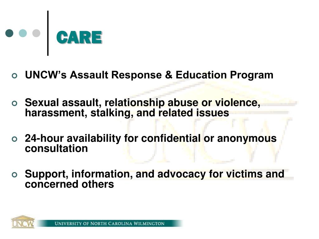 CARE • UNCW’s Assault Response & Education Program • Sexual assault, relationship abuse or violence, harassment, stalking, and related issues • 24-hour availability for confidential or anonymous consultation • Support, information, and advocacy for victims and concerned others