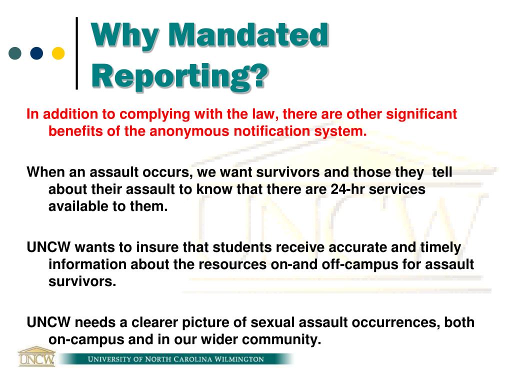 Why Mandated Reporting? In addition to complying with the law, there are other significant benefits of the anonymous notification system. When an assault occurs, we want survivors and those they tell about their assault to know that there are 24-hr services available to them. UNCW wants to insure that students receive accurate and timely information about the resources on-and off-campus for assault survivors. UNCW needs a clearer picture of sexual assault occurrences, both on-campus and in our wider community.