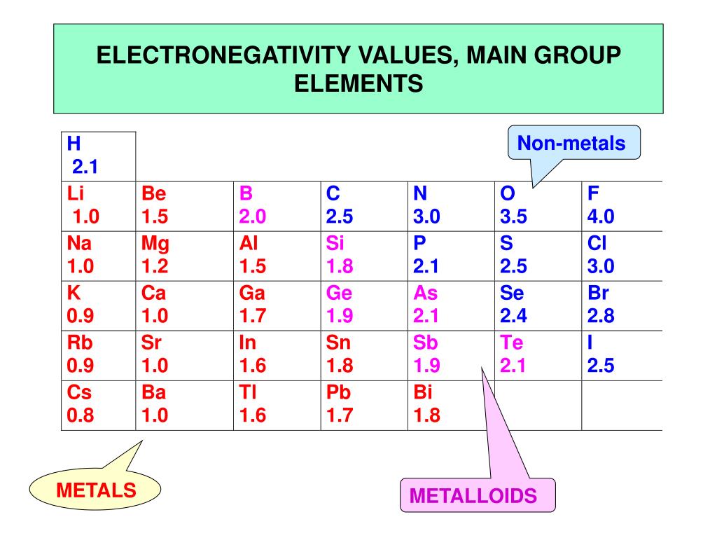 ELECTRONEGATIVITY VALUES, MAIN GROUP ELEMENTS Non-metals METALS METALLOIDS