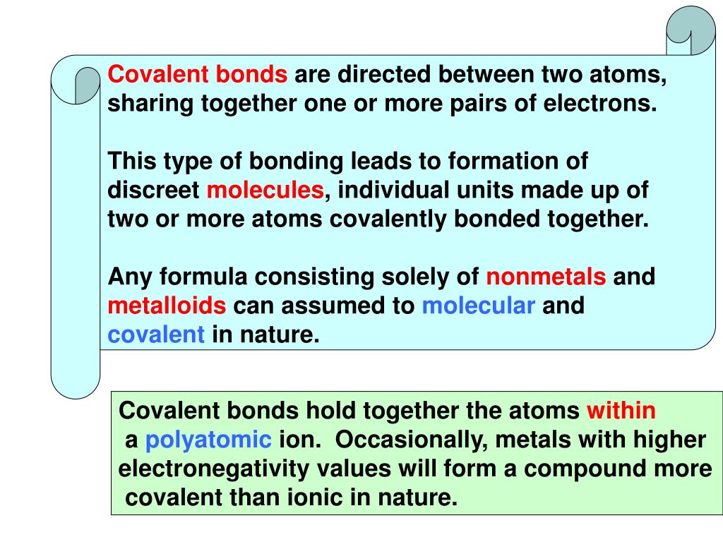 Covalent bonds are directed between two atoms, sharing together one or more pairs of electrons. This type of bonding leads to formation of discreet molecules, individual units made up of two or more atoms covalently bonded together. Any formula consisting solely of nonmetals and metalloids can assumed to molecular and covalent in nature. Covalent bonds hold together the atoms within a polyatomicion. Occasionally, metals with higher electronegativity values will form a compound more covalent than ionic in nature.