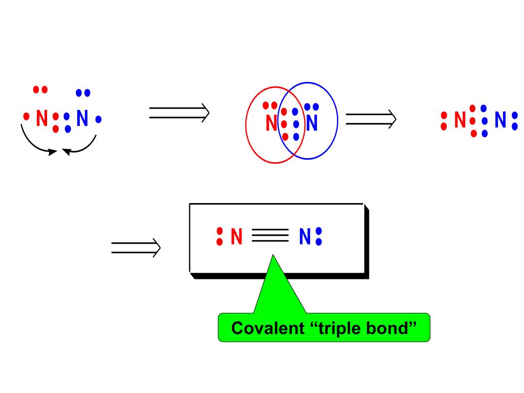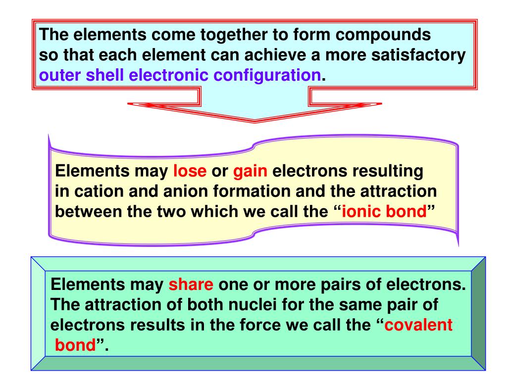 The elements come together to form compounds so that each element can achieve a more satisfactory outer shell electronic configuration. Elements may lose or gain electrons resulting in cation and anion formation and the attraction between the two which we call the “ionic bond” Elements may share one or more pairs of electrons. The attraction of both nuclei for the same pair of electrons results in the force we call the “covalent bond”.