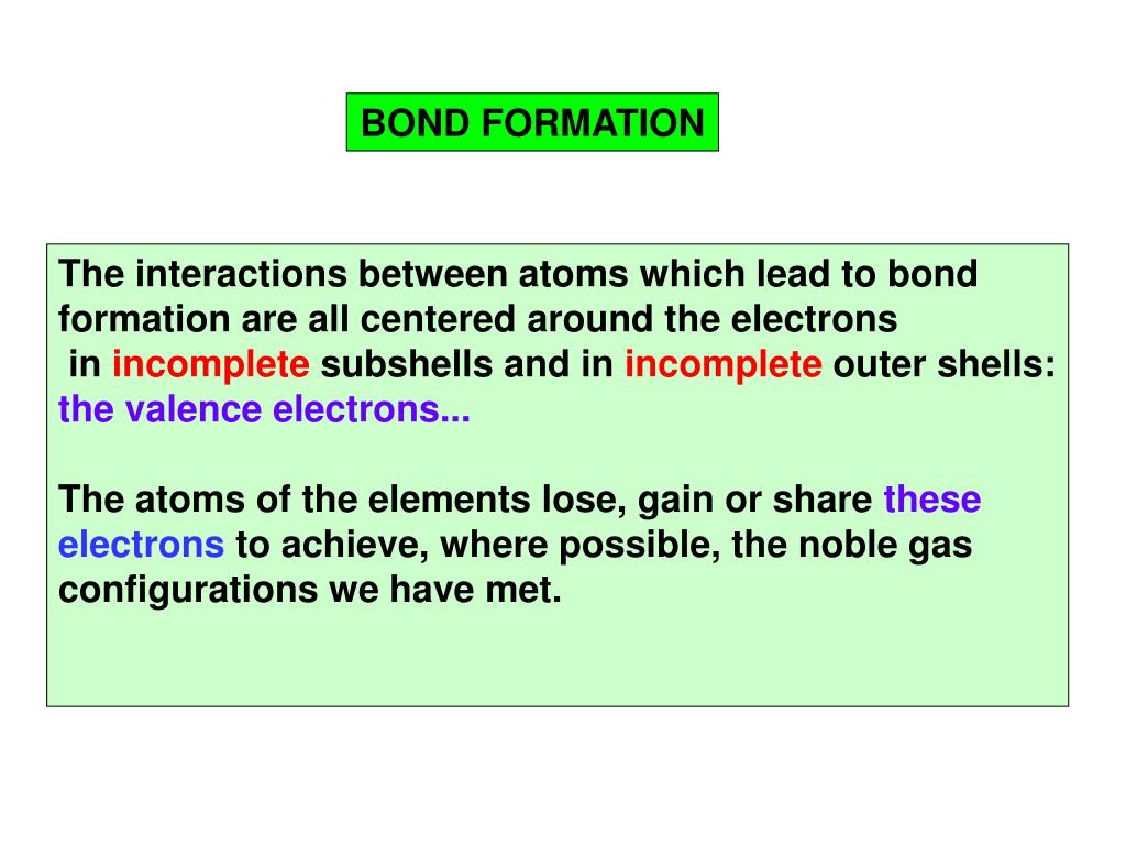 BOND FORMATION The interactions between atoms which lead to bond formation are all centered around the electrons in incomplete subshells and in incompleteouter shells: the valence electrons... The atoms of the elements lose, gain or share these electrons to achieve, where possible, the noble gas configurations we have met.
