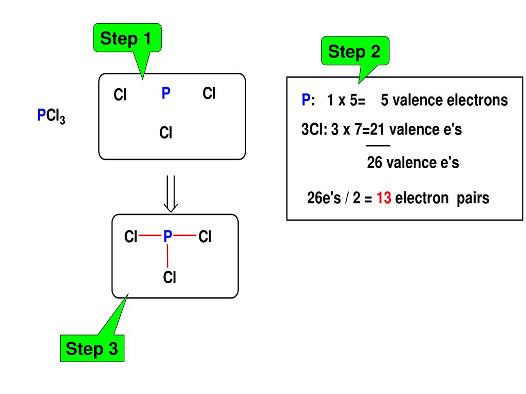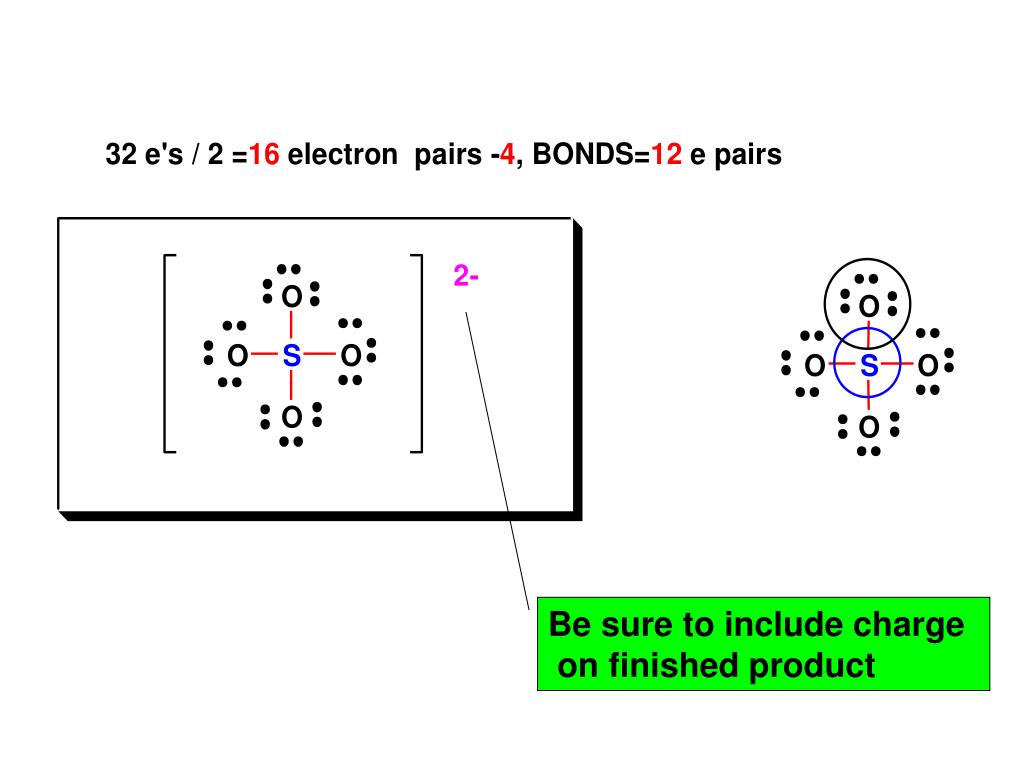 Second Step • Add up all available valence electrons. • If species is cation, subtract positive charge from total. • If species is anion,add negative charge to total. • Divide total by two to determine available number of • electron pairs Third Step Place a pair of electrons between each pair of bonded atoms to represent a single bond (use a “dash”!)