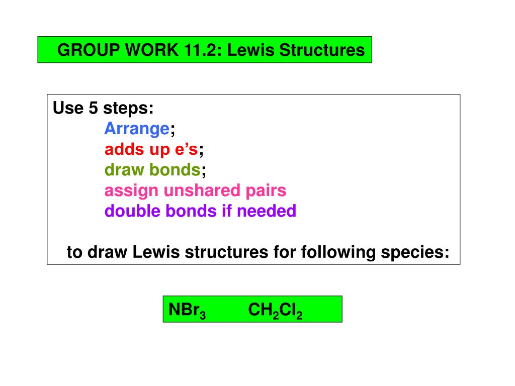 GROUP WORK 11.2: Lewis Structures Use 5 steps: Arrange; adds up e’s; draw bonds; assign unshared pairs double bonds if needed to draw Lewis structures for following species: NBr3 CH2Cl2