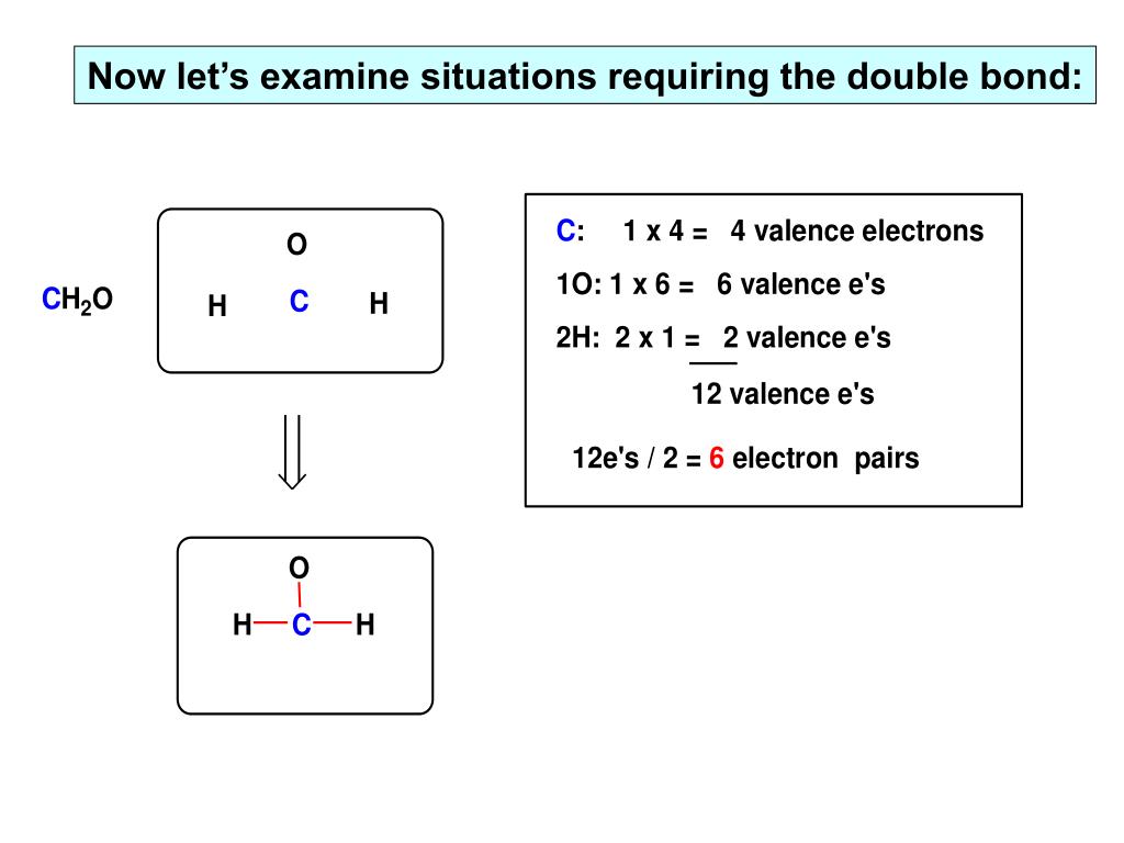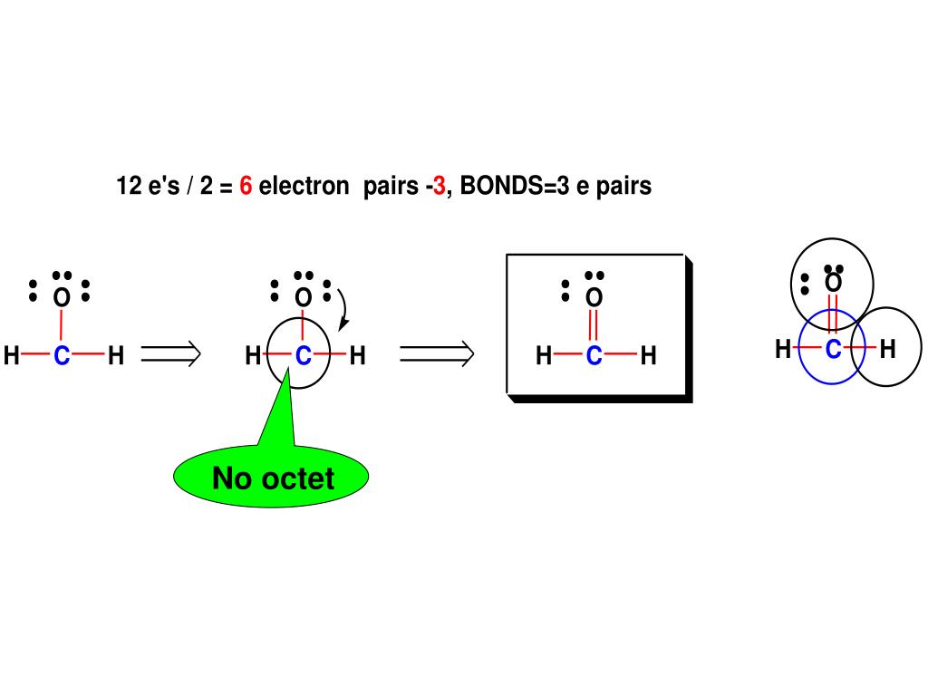 Fourth Step Place leftover electron pairs around “terminal” atoms to achieve their octet (except H). Do central atomlast. Fifth Step Examine central atom to determine if a double or triple bond is required to achieve the central atom’s octet. Do so using unshared pairs, IF central atom is: C, N, P, O, S