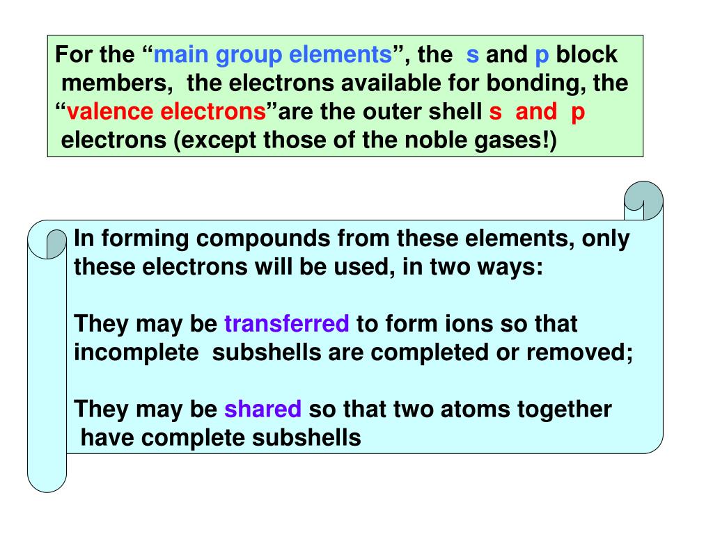 For the “main group elements”, the s and p block members, the electrons available for bonding, the “valence electrons”are the outer shell sand p electrons (except those of the noble gases!) In forming compounds from these elements, only these electrons will be used, in two ways: They may be transferred to form ions so that incomplete subshells are completed or removed; They may be shared so that two atoms together have complete subshells