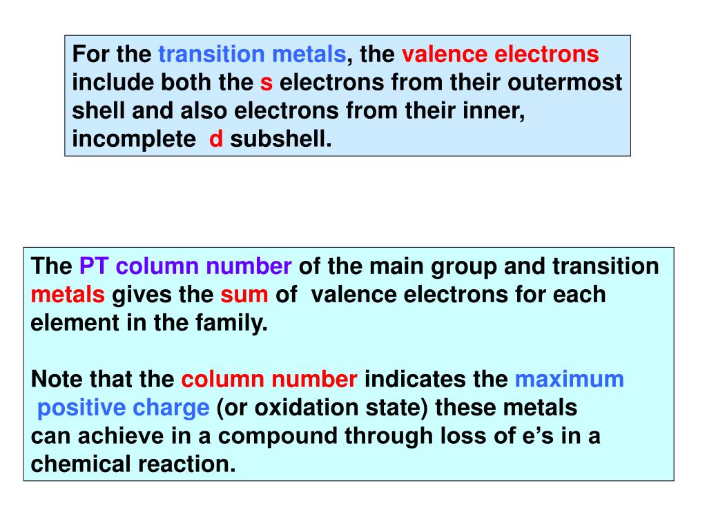 For the transition metals, the valence electrons include both the s electrons from their outermost shell and also electrons from their inner, incomplete d subshell. The PT column number of the main group and transition metals gives the sum of valence electrons for each element in the family. Note that the column number indicates the maximum positive charge (or oxidation state) these metals can achieve in a compound through loss of e’s in a chemical reaction.