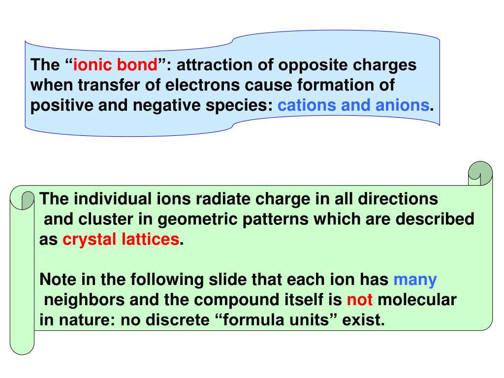 The “ionic bond”: attraction of opposite charges when transfer of electrons cause formation of positive and negative species: cations and anions. The individual ions radiate charge in all directions and cluster in geometric patterns which are described as crystal lattices. Note in the following slide that each ion has many neighbors and the compound itself is not molecular in nature: no discrete “formula units” exist.