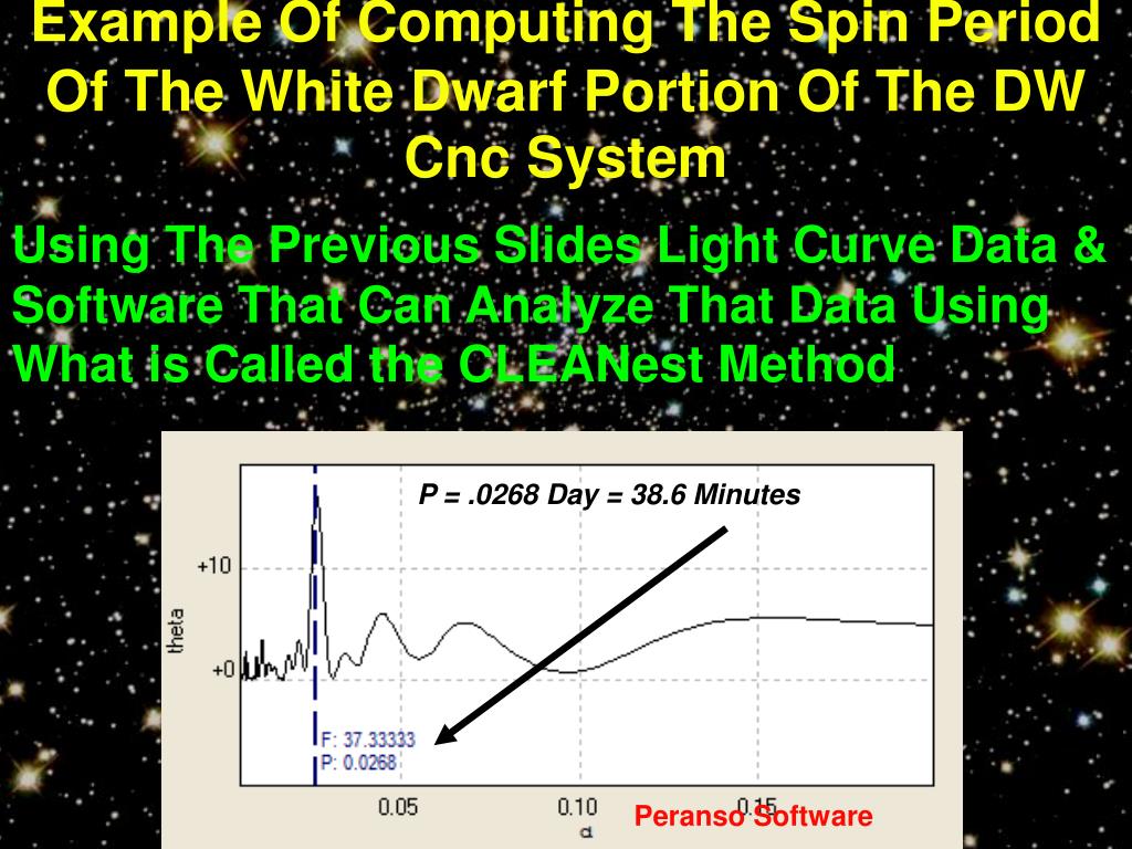 Example Of Computing The Spin PeriodOf The White Dwarf Portion Of The DW Cnc System Using The Previous Slides Light Curve Data & Software That Can Analyze That Data Using What is Called the CLEANest Method P = .0268 Day = 38.6 Minutes Peranso Software
