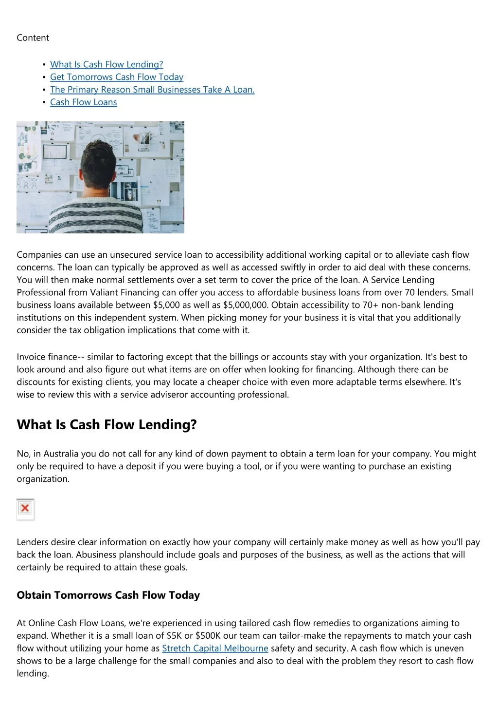 Content • • • • What Is Cash Flow Lending? Get Tomorrows Cash Flow Today The Primary Reason Small Businesses Take A Loan. Cash Flow Loans Companies can use an unsecured service loan to accessibility additional working capital or to alleviate cash flow concerns. The loan can typically be approved as well as accessed swiftly in order to aid deal with these concerns. You will then make normal settlements over a set term to cover the price of the loan. A Service Lending Professional from Valiant Financing can offer you access to affordable business loans from over 70 lenders. Small business loans available between $5,000 as well as $5,000,000. Obtain accessibility to 70+ non-bank lending institutions on this independent system. When picking money for your business it is vital that you additionally consider the tax obligation implications that come with it. Invoice finance-- similar to factoring except that the billings or accounts stay with your organization. It's best to look around and also figure out what items are on offer when looking for financing. Although there can be discounts for existing clients, you may locate a cheaper choice with even more adaptable terms elsewhere. It's wise to review this with a service adviseror accounting professional. What Is Cash Flow Lending? No, in Australia you do not call for any kind of down payment to obtain a term loan for your company. You might only be required to have a deposit if you were buying a tool, or if you were wanting to purchase an existing organization. Lenders desire clear information on exactly how your company will certainly make money as well as how you'll pay back the loan. Abusiness planshould include goals and purposes of the business, as well as the actions that will certainly be required to attain these goals. Obtain Tomorrows Cash Flow Today At Online Cash Flow Loans, we're experienced in using tailored cash flow remedies to organizations aiming to expand. Whether it is a small loan of $5K or $500K our team can tailor-make the repayments to match your cash flow without utilizing your home as Stretch Capital Melbourne safety and security. A cash flow which is uneven shows to be a large challenge for the small companies and also to deal with the problem they resort to cash flow lending.