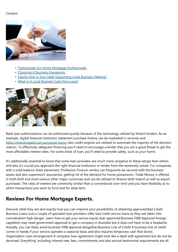Content • • • • Testimonials For Home Mortgage Professionals. Choosing A Business Framework. Exactly How Is Your State Supporting Local Business Healing? What Is A Local Business Cash Flow Loan? Bank loan authorizations can be authorized quickly because of the technology utilized by fintech lenders. As an example, digital financial institution statement purchase history can be evaluated in seconds and https://stretchcapital.com.au/caveat-loans/ also credit engines are utilized to automate the majority of the decision metrics. To effectively safeguard financing you'll need to encourage a lender that you are a good threat to get the most affordable interest rates. For some kinds of loan, you'll need to provide safety, such as your home. It's additionally essential to know that some loan providers are much more receptive to these setups than others and also it's crucial you approach the right financial institution or lender from the extremely outset. For companies with a solid balance sheet placement, Profession Finance centers can frequently be secured with the business assets and also supervisors' assurances, getting rid of the demand for home possessions. Trade Money is offered in both AUD and most various other major currencies and can be utilized to finance both import as well as export purchases. The rates of interest are commonly similar than a conventional over-limit and you have flexibility as to which transactions you want to fund and for what term. Reviews For Home Mortgage Experts. Discover what they are and exactly how you can improve your possibilities of obtaining approved.Bad Credit Business Loans Just a couple of specialist loan providers offer bad credit service loans as they are taken into consideration high danger. Learn how to get your service equity loan approved.Business FIRB Approval Foreign capitalists may need government approval to get a company in Australia but it does not have to be a headache. Actually, you can likely avoid business FIRB approval altogether.Business Line of Credit A business line of credit comes in handy if your service operates a seasonal basis and also requires temporary cash flow boost. Organization Loan Arrangement A company loan agreement might look like a dealt with agreement but do not be deceived. Everything, including interest rate, fees, commitments and also annual testimonial requirements are all