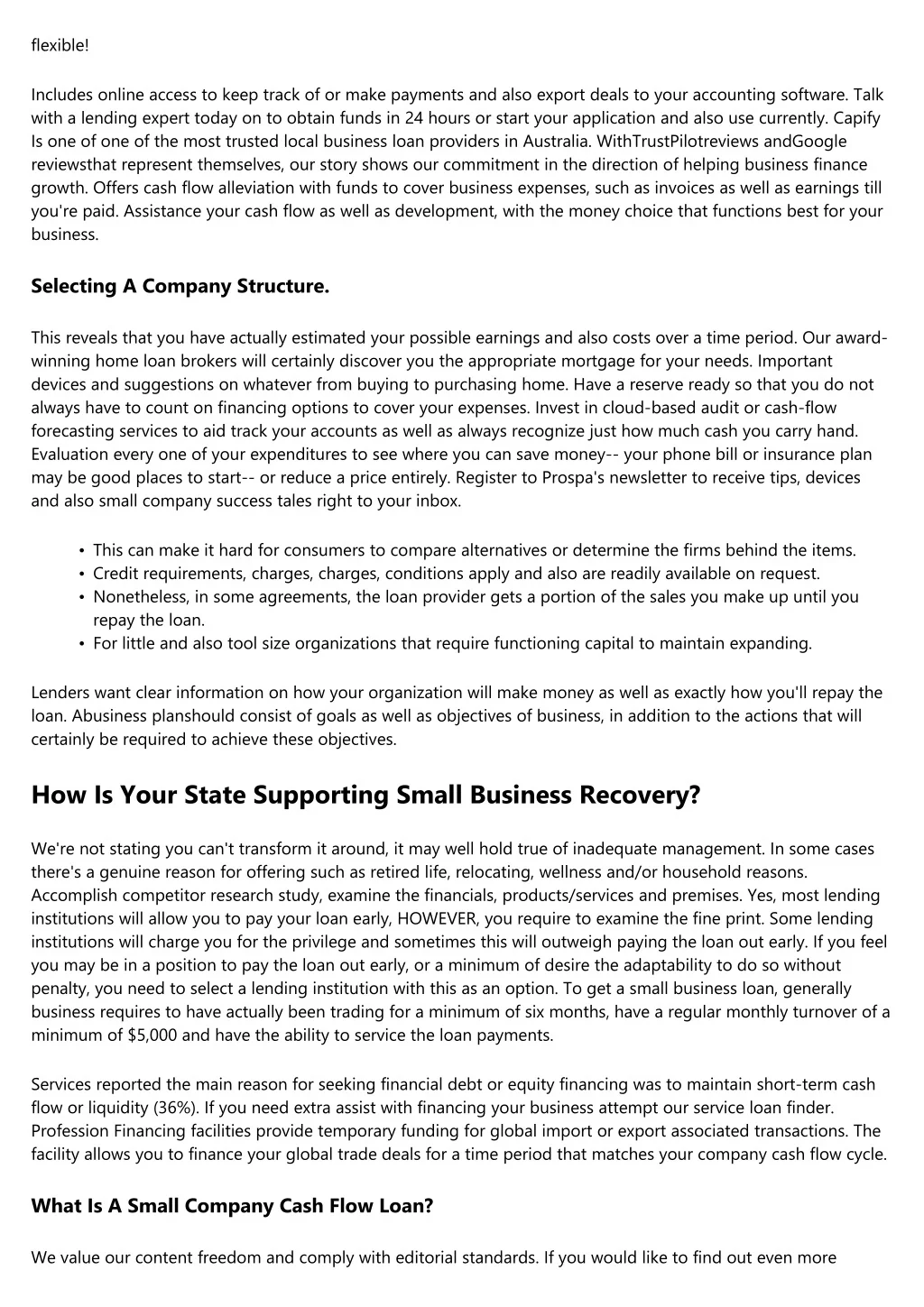 flexible! Includes online access to keep track of or make payments and also export deals to your accounting software. Talk with a lending expert today on to obtain funds in 24 hours or start your application and also use currently. Capify Is one of one of the most trusted local business loan providers in Australia. WithTrustPilotreviews andGoogle reviewsthat represent themselves, our story shows our commitment in the direction of helping business finance growth. Offers cash flow alleviation with funds to cover business expenses, such as invoices as well as earnings till you're paid. Assistance your cash flow as well as development, with the money choice that functions best for your business. Selecting A Company Structure. This reveals that you have actually estimated your possible earnings and also costs over a time period. Our award- winning home loan brokers will certainly discover you the appropriate mortgage for your needs. Important devices and suggestions on whatever from buying to purchasing home. Have a reserve ready so that you do not always have to count on financing options to cover your expenses. Invest in cloud-based audit or cash-flow forecasting services to aid track your accounts as well as always recognize just how much cash you carry hand. Evaluation every one of your expenditures to see where you can save money-- your phone bill or insurance plan may be good places to start-- or reduce a price entirely. Register to Prospa's newsletter to receive tips, devices and also small company success tales right to your inbox. • • • This can make it hard for consumers to compare alternatives or determine the firms behind the items. Credit requirements, charges, charges, conditions apply and also are readily available on request. Nonetheless, in some agreements, the loan provider gets a portion of the sales you make up until you repay the loan. For little and also tool size organizations that require functioning capital to maintain expanding. • Lenders want clear information on how your organization will make money as well as exactly how you'll repay the loan. Abusiness planshould consist of goals as well as objectives of business, in addition to the actions that will certainly be required to achieve these objectives. How Is Your State Supporting Small Business Recovery? We're not stating you can't transform it around, it may well hold true of inadequate management. In some cases there's a genuine reason for offering such as retired life, relocating, wellness and/or household reasons. Accomplish competitor research study, examine the financials, products/services and premises. Yes, most lending institutions will allow you to pay your loan early, HOWEVER, you require to examine the fine print. Some lending institutions will charge you for the privilege and sometimes this will outweigh paying the loan out early. If you feel you may be in a position to pay the loan out early, or a minimum of desire the adaptability to do so without penalty, you need to select a lending institution with this as an option. To get a small business loan, generally business requires to have actually been trading for a minimum of six months, have a regular monthly turnover of a minimum of $5,000 and have the ability to service the loan payments. Services reported the main reason for seeking financial debt or equity financing was to maintain short-term cash flow or liquidity (36%). If you need extra assist with financing your business attempt our service loan finder. Profession Financing facilities provide temporary funding for global import or export associated transactions. The facility allows you to finance your global trade deals for a time period that matches your company cash flow cycle. What Is A Small Company Cash Flow Loan? We value our content freedom and comply with editorial standards. If you would like to find out even more