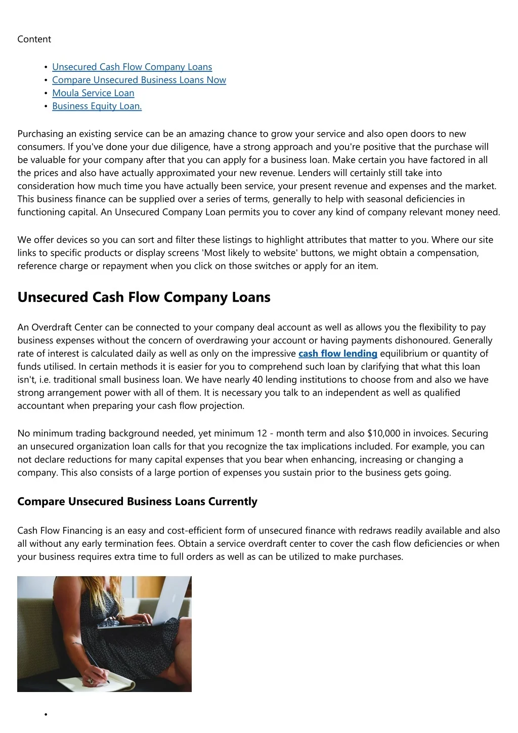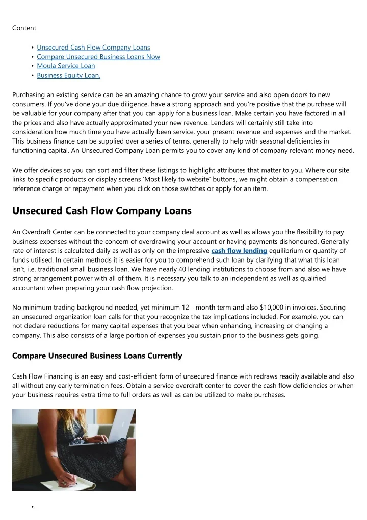 Content • • • • Unsecured Cash Flow Company Loans Compare Unsecured Business Loans Now Moula Service Loan Business Equity Loan. Purchasing an existing service can be an amazing chance to grow your service and also open doors to new consumers. If you've done your due diligence, have a strong approach and you're positive that the purchase will be valuable for your company after that you can apply for a business loan. Make certain you have factored in all the prices and also have actually approximated your new revenue. Lenders will certainly still take into consideration how much time you have actually been service, your present revenue and expenses and the market. This business finance can be supplied over a series of terms, generally to help with seasonal deficiencies in functioning capital. An Unsecured Company Loan permits you to cover any kind of company relevant money need. We offer devices so you can sort and filter these listings to highlight attributes that matter to you. Where our site links to specific products or display screens 'Most likely to website' buttons, we might obtain a compensation, reference charge or repayment when you click on those switches or apply for an item. Unsecured Cash Flow Company Loans An Overdraft Center can be connected to your company deal account as well as allows you the flexibility to pay business expenses without the concern of overdrawing your account or having payments dishonoured. Generally rate of interest is calculated daily as well as only on the impressive cash flow lending equilibrium or quantity of funds utilised. In certain methods it is easier for you to comprehend such loan by clarifying that what this loan isn't, i.e. traditional small business loan. We have nearly 40 lending institutions to choose from and also we have strong arrangement power with all of them. It is necessary you talk to an independent as well as qualified accountant when preparing your cash flow projection. No minimum trading background needed, yet minimum 12 - month term and also $10,000 in invoices. Securing an unsecured organization loan calls for that you recognize the tax implications included. For example, you can not declare reductions for many capital expenses that you bear when enhancing, increasing or changing a company. This also consists of a large portion of expenses you sustain prior to the business gets going. Compare Unsecured Business Loans Currently Cash Flow Financing is an easy and cost-efficient form of unsecured finance with redraws readily available and also all without any early termination fees. Obtain a service overdraft center to cover the cash flow deficiencies or when your business requires extra time to full orders as well as can be utilized to make purchases. •