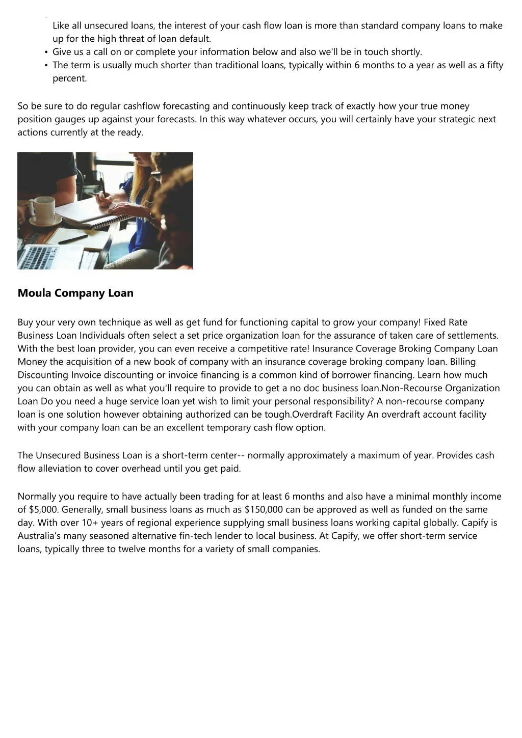 • Like all unsecured loans, the interest of your cash flow loan is more than standard company loans to make up for the high threat of loan default. Give us a call on or complete your information below and also we'll be in touch shortly. The term is usually much shorter than traditional loans, typically within 6 months to a year as well as a fifty percent. • • So be sure to do regular cashflow forecasting and continuously keep track of exactly how your true money position gauges up against your forecasts. In this way whatever occurs, you will certainly have your strategic next actions currently at the ready. Moula Company Loan Buy your very own technique as well as get fund for functioning capital to grow your company! Fixed Rate Business Loan Individuals often select a set price organization loan for the assurance of taken care of settlements. With the best loan provider, you can even receive a competitive rate! Insurance Coverage Broking Company Loan Money the acquisition of a new book of company with an insurance coverage broking company loan. Billing Discounting Invoice discounting or invoice financing is a common kind of borrower financing. Learn how much you can obtain as well as what you'll require to provide to get a no doc business loan.Non-Recourse Organization Loan Do you need a huge service loan yet wish to limit your personal responsibility? A non-recourse company loan is one solution however obtaining authorized can be tough.Overdraft Facility An overdraft account facility with your company loan can be an excellent temporary cash flow option. The Unsecured Business Loan is a short-term center-- normally approximately a maximum of year. Provides cash flow alleviation to cover overhead until you get paid. Normally you require to have actually been trading for at least 6 months and also have a minimal monthly income of $5,000. Generally, small business loans as much as $150,000 can be approved as well as funded on the same day. With over 10+ years of regional experience supplying small business loans working capital globally. Capify is Australia's many seasoned alternative fin-tech lender to local business. At Capify, we offer short-term service loans, typically three to twelve months for a variety of small companies.