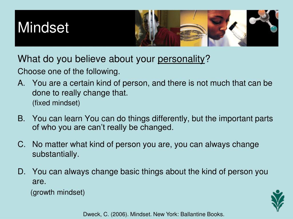 What do you believe about your personality? Choose one of the following. You are a certain kind of person, and there is not much that can be done to really change that. (fixed mindset) You can learn You can do things differently, but the important parts of who you are can’t really be changed. No matter what kind of person you are, you can always change substantially. You can always change basic things about the kind of person you are. (growth mindset) Mindset Dweck, C. (2006). Mindset. New York: Ballantine Books.