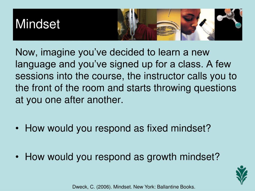 Now, imagine you’ve decided to learn a new language and you’ve signed up for a class. A few sessions into the course, the instructor calls you to the front of the room and starts throwing questions at you one after another. How would you respond as fixed mindset? How would you respond as growth mindset? Mindset Dweck, C. (2006). Mindset. New York: Ballantine Books.