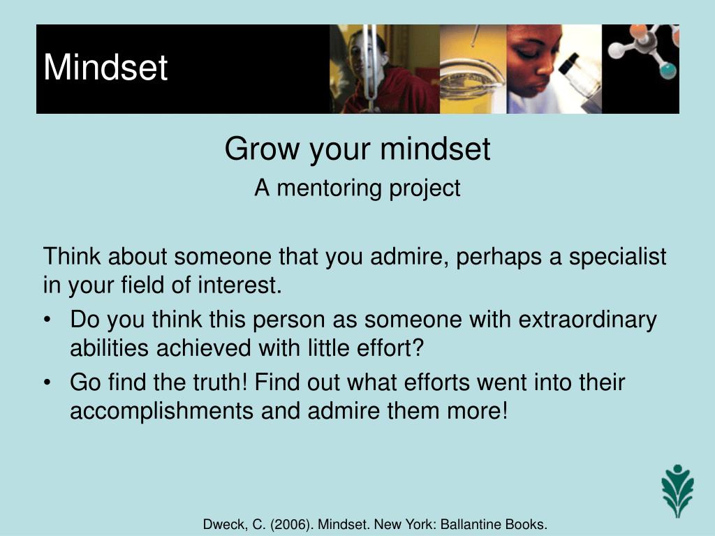 Grow your mindset A mentoring project Think about someone that you admire, perhaps a specialist in your field of interest. Do you think this person as someone with extraordinary abilities achieved with little effort? Go find the truth! Find out what efforts went into their accomplishments and admire them more! Mindset Dweck, C. (2006). Mindset. New York: Ballantine Books.