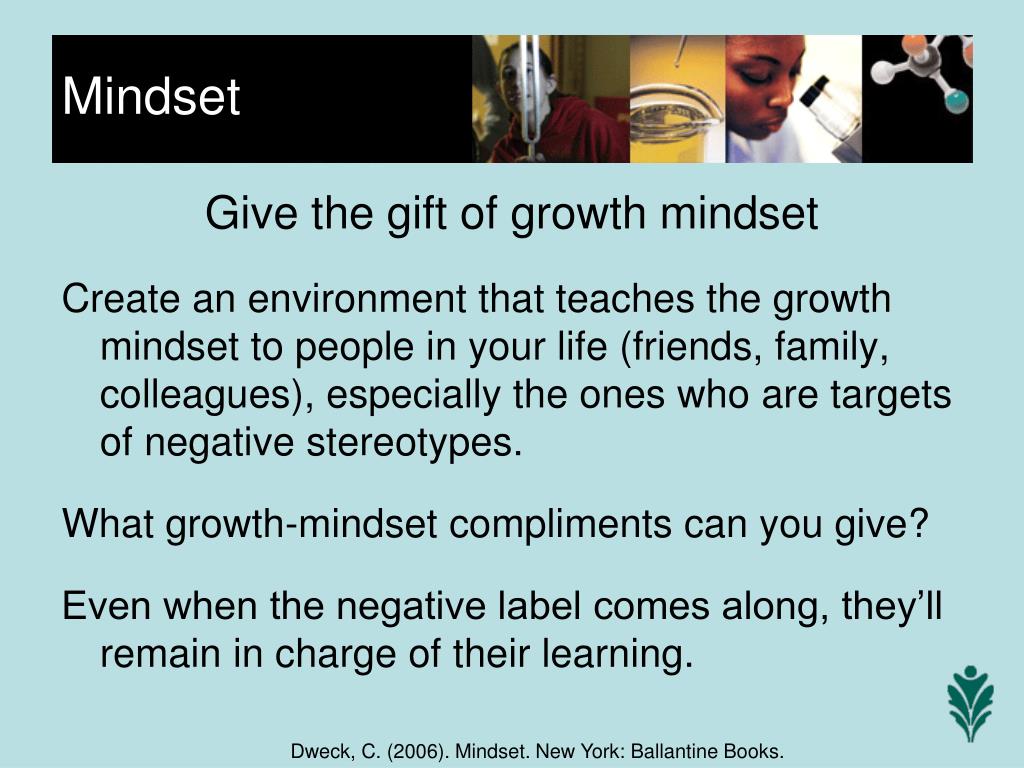 Give the gift of growth mindset Create an environment that teaches the growth mindset to people in your life (friends, family, colleagues), especially the ones who are targets of negative stereotypes. What growth-mindset compliments can you give? Even when the negative label comes along, they’ll remain in charge of their learning. Mindset Dweck, C. (2006). Mindset. New York: Ballantine Books.