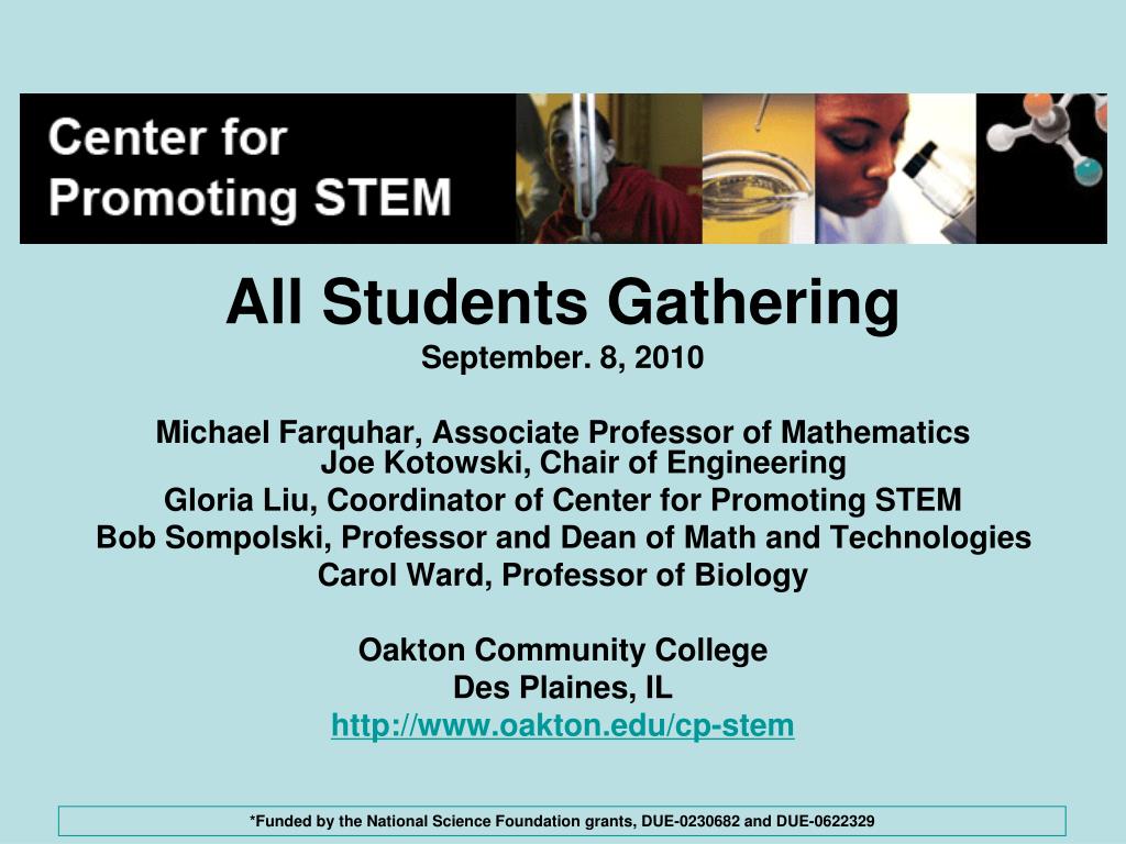 All Students Gathering September. 8, 2010 Michael Farquhar, Associate Professor of MathematicsJoe Kotowski, Chair of Engineering Gloria Liu, Coordinator of Center for Promoting STEM Bob Sompolski, Professor and Dean of Math and Technologies Carol Ward, Professor of Biology Oakton Community College Des Plaines, IL http://www.oakton.edu/cp-stem *Funded by the National Science Foundation grants, DUE-0230682 and DUE-0622329