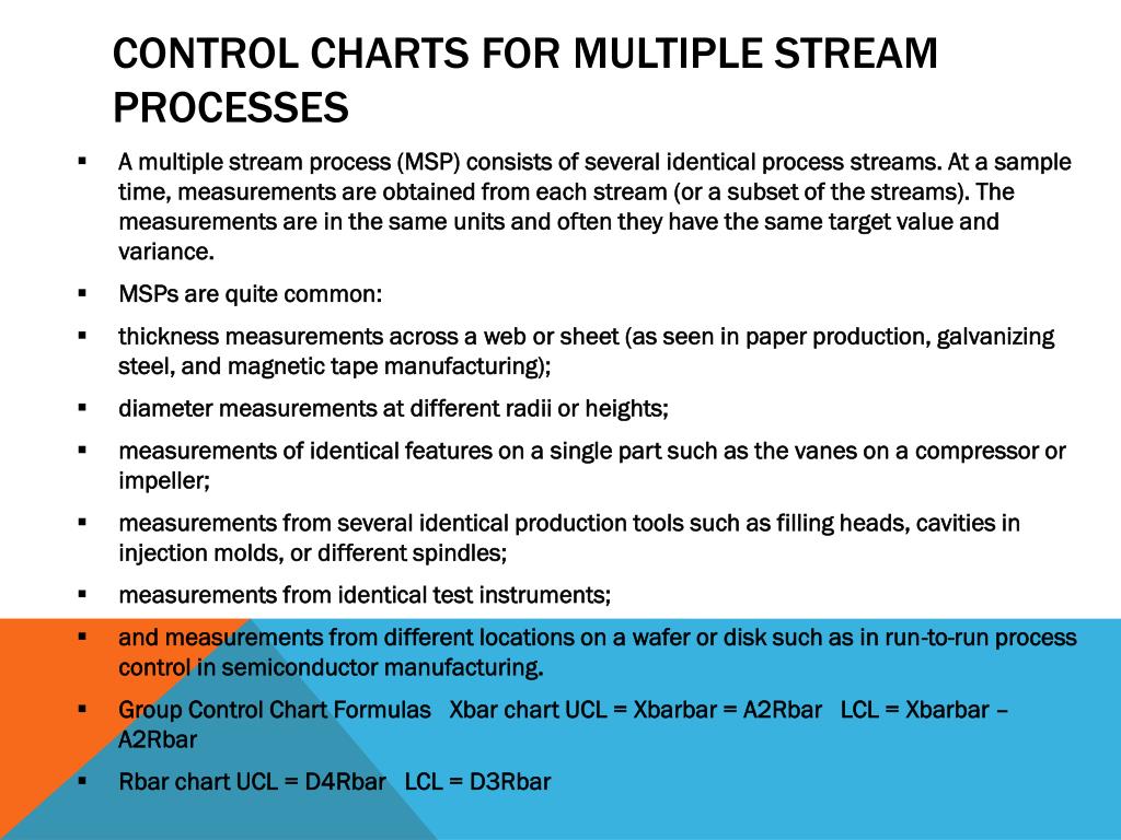 Control Charts for Multiple Stream Processes • A multiple stream process (MSP) consists of several identical processstreams. At a sample time, measurements are obtained from each stream (or a subset of the streams). The measurements are in the same units and often they have the same target value and variance. • MSPs are quite common: • thickness measurements across a webor sheet (as seen in paper production, galvanizing steel, and magnetic tape manufacturing); • diameter measurements at different radii or heights; • measurements of identical features on a single part such as the vanes on a compressor or impeller; • measurements from several identical production tools such as filling heads, cavities in injection molds, or different spindles; • measurements from identical test instruments; • and measurements from different locations on a wafer or disk such as in run-to-run process control in semiconductor manufacturing. • Group Control Chart Formulas Xbar chart UCL = Xbarbar = A2Rbar LCL = Xbarbar –A2Rbar • Rbar chart UCL = D4Rbar LCL = D3Rbar