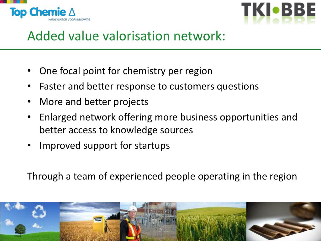 Added value valorisation network: • Onefocal point forchemistry per region • Fasterandbetter response tocustomersquestions • More andbetterprojects • Enlargednetworkoffering more business opportunitiesandbetter access toknowledge sources • Improved support forstartups Through a team of experiencedpeople operating in the region