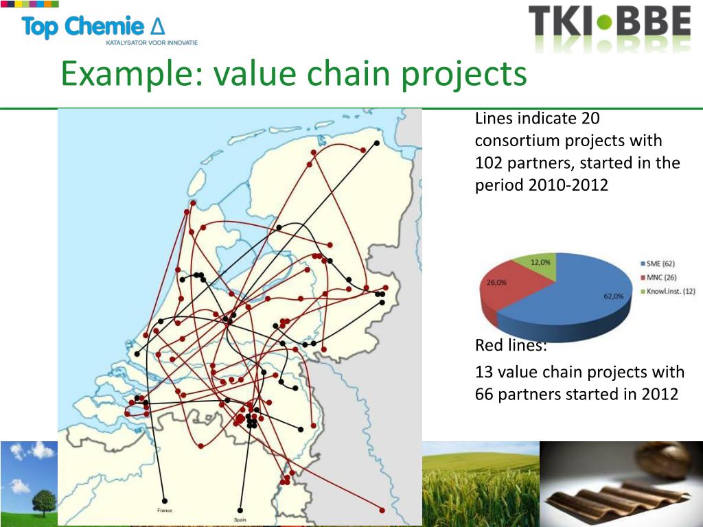 Example: value chain projects Lines indicate 20 consortium projectswith 102 partners, started in the period 2010-2012 Red lines: 13 value chain projectswith 66 partners started in 2012