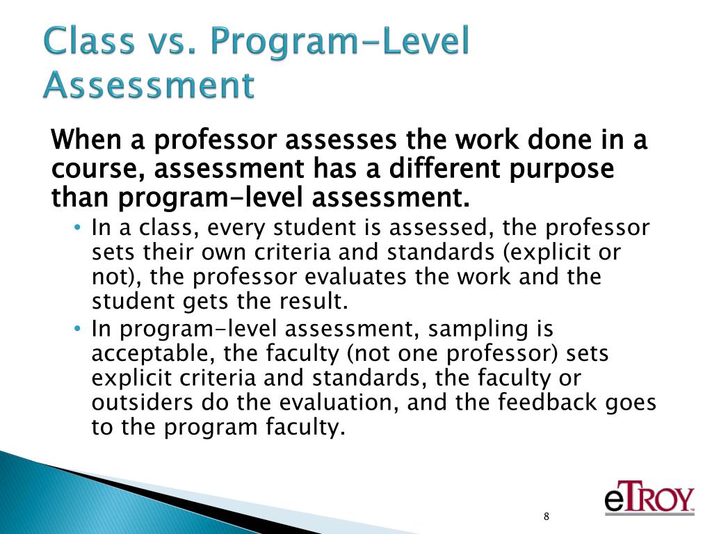 Class vs. Program-Level Assessment When a professor assesses the work done in a course, assessment has a different purpose than program-level assessment. • In a class, every student is assessed, the professor sets their own criteria and standards (explicit or not), the professor evaluates the work and the student gets the result. • In program-level assessment, sampling is acceptable, the faculty (not one professor) sets explicit criteria and standards, the faculty or outsiders do the evaluation, and the feedback goes to the program faculty.