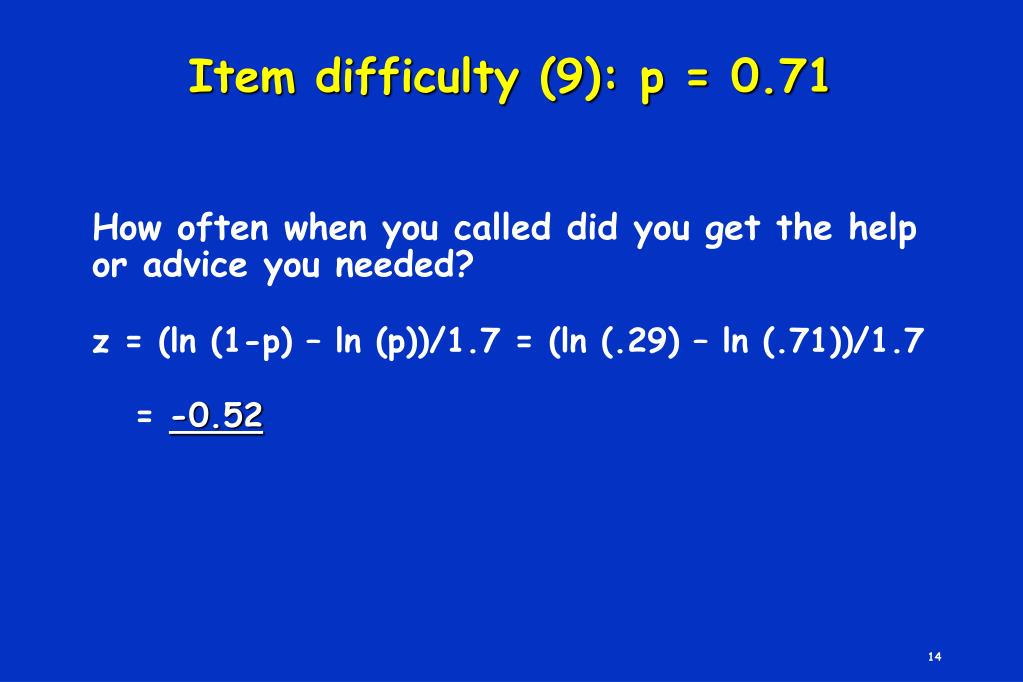 Item difficulty (9): p = 0.71 How often when you called did you get the help or advice you needed? z = (ln (1-p) – ln (p))/1.7 = (ln (.29) – ln (.71))/1.7 = -0.52