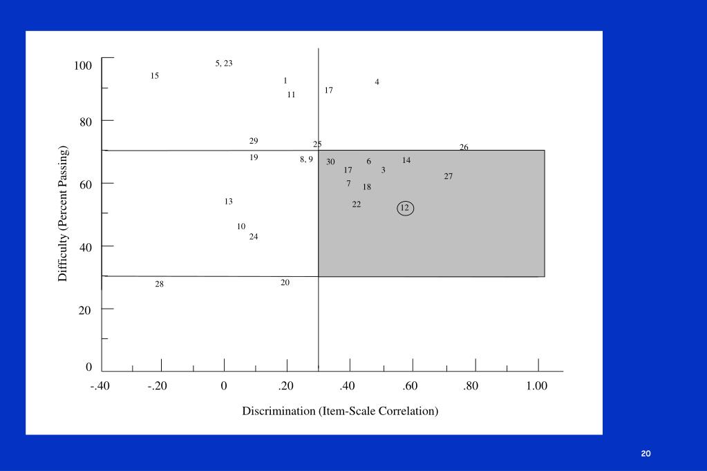 100 5, 23 15 1 4 17 11 16 80 29 25 26 19 8, 9 14 6 30 17 3 27 60 7 18 13 22 Difficulty (Percent Passing) 12 10 24 40 20 28 20 0 -.40 -.20 0 .20 .40 .60 .80 1.00 Discrimination (Item-Scale Correlation)